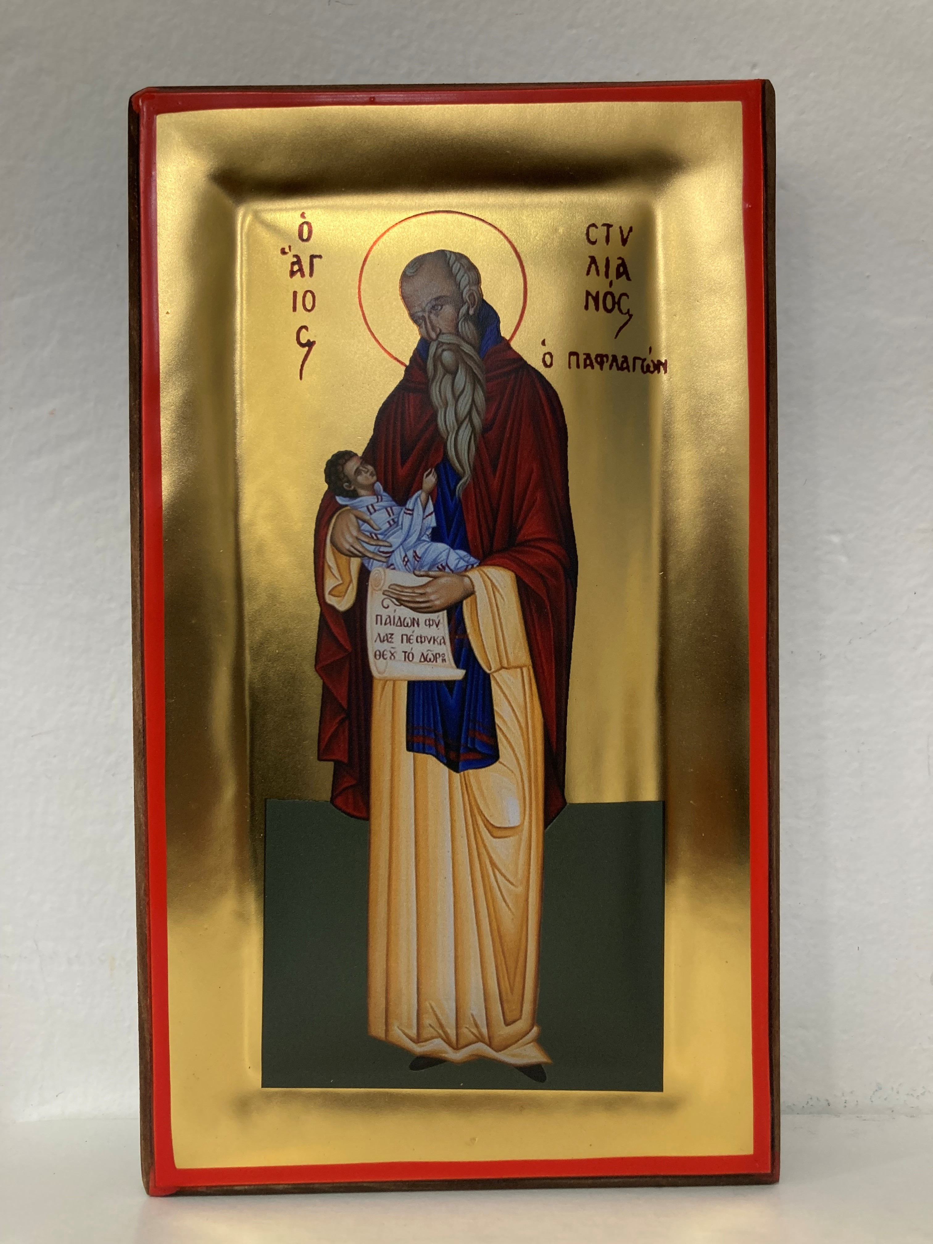 Άγιος Στυλιανός σε σκαφτό ξύλο με φύλλο χρυσού και διάσταση : 19 x 11 εκ.
