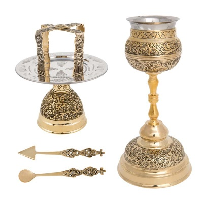 Δισκοπότηρο ορειχάλκινο σκαλιστό επίχρυσο χωρητικότητας 250 ml σε 3 μεγέθη. Σετ 5 τεμαχίων: Άγιο Ποτήριον, Δισκάριο, Αστερίσκος, Λόγχη, Λαβίδα