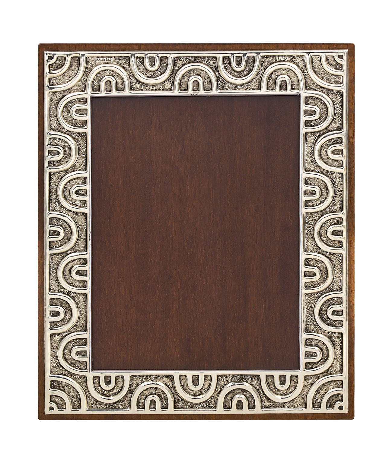 Κορνίζα ασημένια 925° με ξύλο και καμπυλωτά σχέδια σε διάσταση : 18 x 13 εκ.