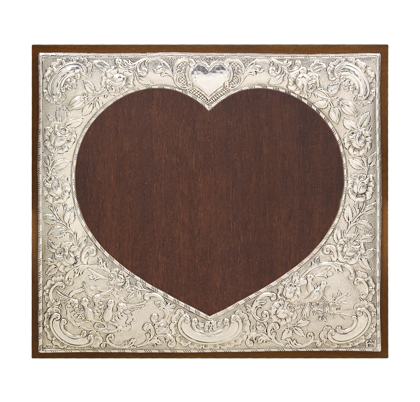 Κορνίζα ασημένια 925° με ξύλο και σχέδιο καρδιάς στο κέντρο σε διάσταση : 18 x 20 εκ.