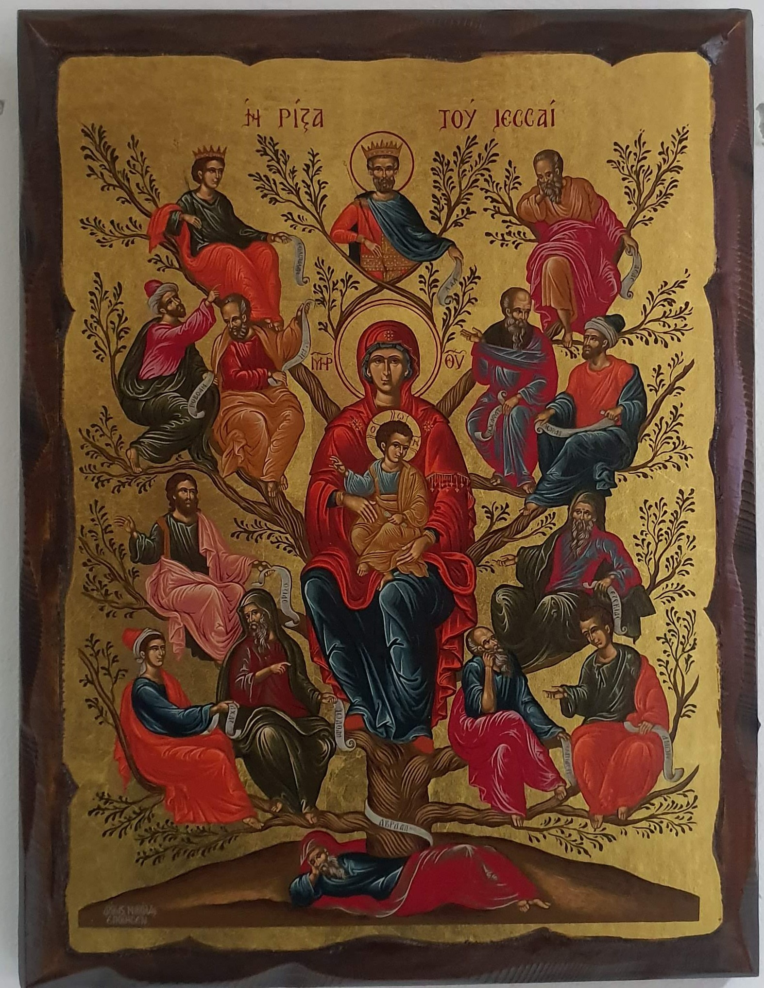 Ρίζα του Ιεσσαί σε πεπαλαιωμένο πελεκυτό ξύλο πεύκο σε καμβά με φύλλο χρυσού και διάσταση : 20 x 16 εκ.