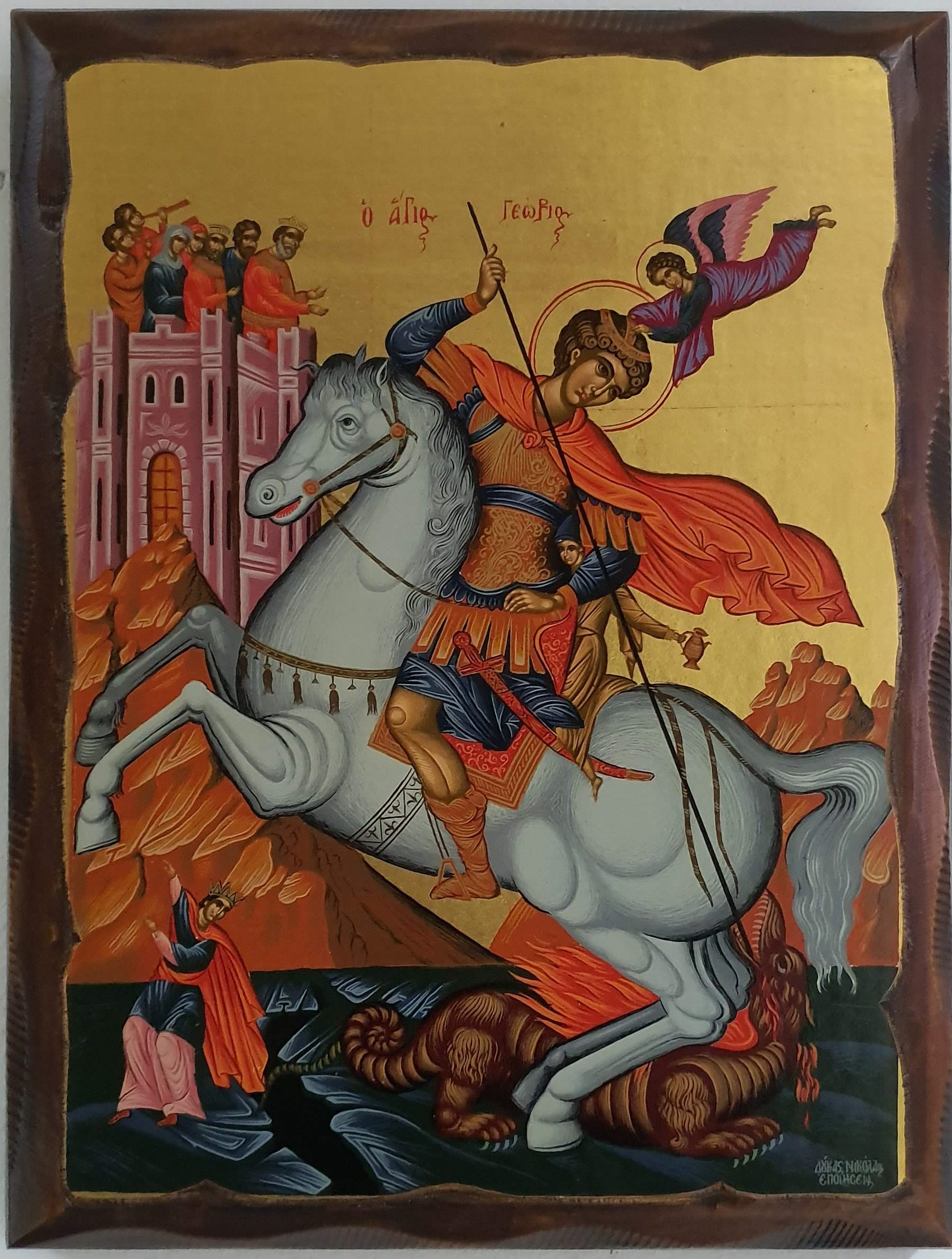 Άγιος Γεώργιος σε πεπαλαιωμένο πελεκυτό ξύλο πεύκο σε καμβά με φύλλο χρυσού και διάσταση : 20 x 16 εκ.