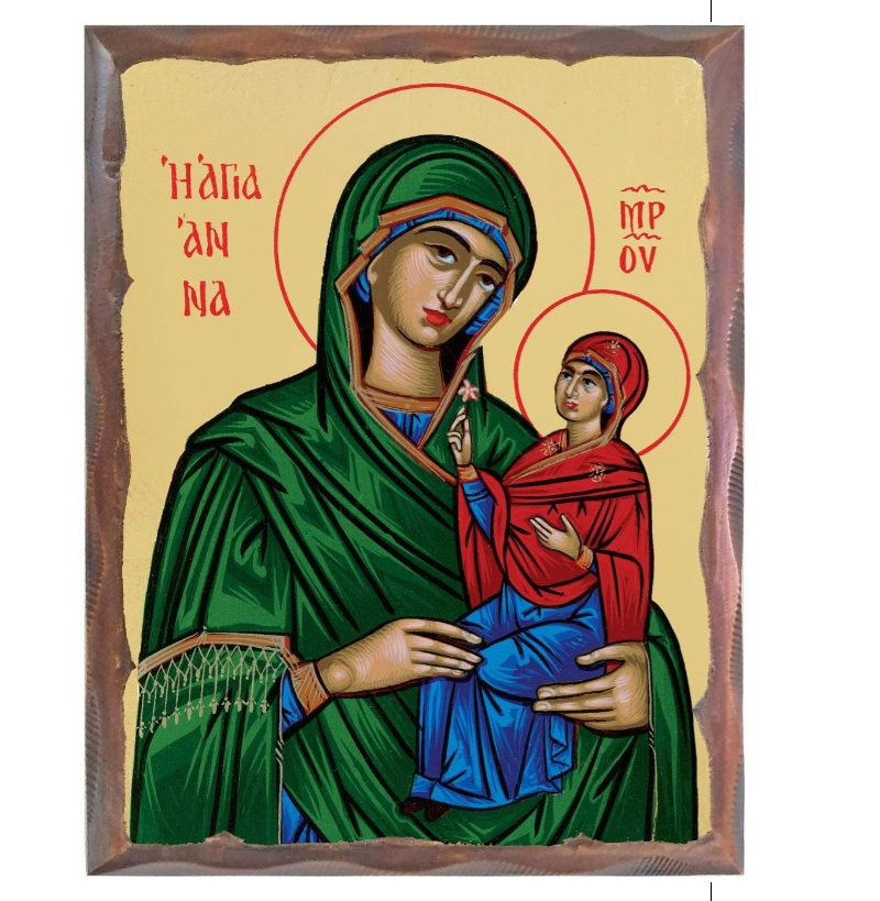 Αγία Άννα σε πεπαλαιωμένο πελεκυτό ξύλο πεύκο σε καμβά με φύλλο χρυσού και διάσταση : 20 x 16 εκ.