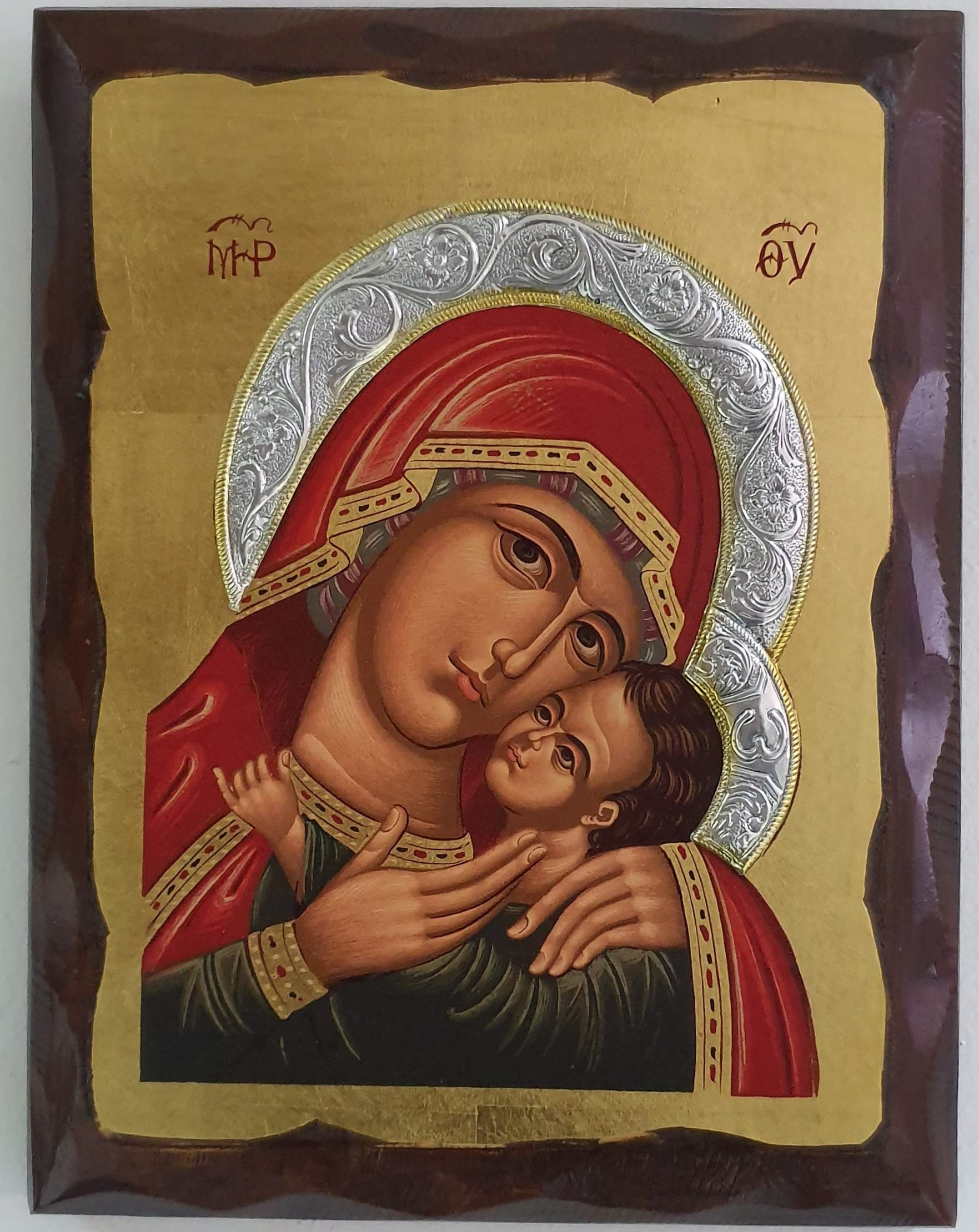 Παναγία Γλυκοφιλούσα σε καμβά με φύλλο χρυσού, ασημένιο φωτοστέφανο και διάσταση : 27 x 20 εκ.