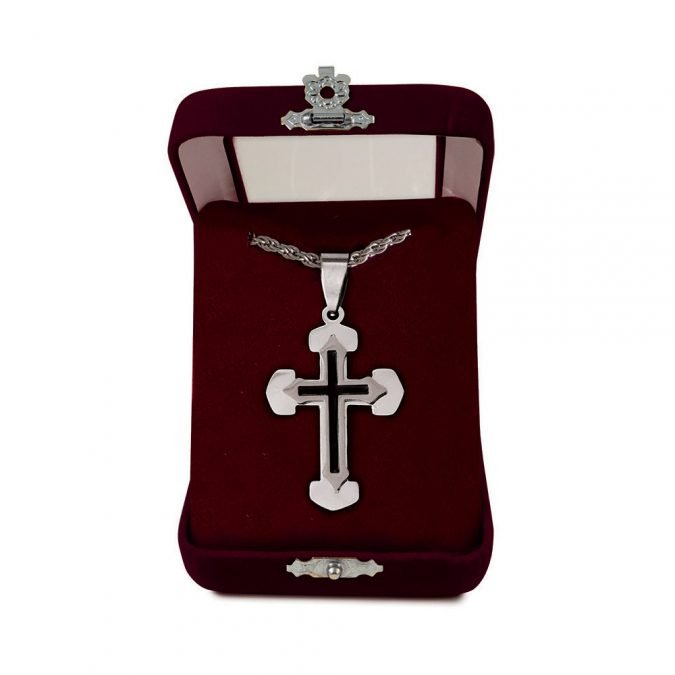 Σταυρός Λαιμού ανοξείδωτος με αλυσίδα 55 εκατοστών από ατσάλι σε διάσταση : 5 x 2,5 εκ. Προσφέρεται σε βελούδινο κουτάκι πολυτελείας.