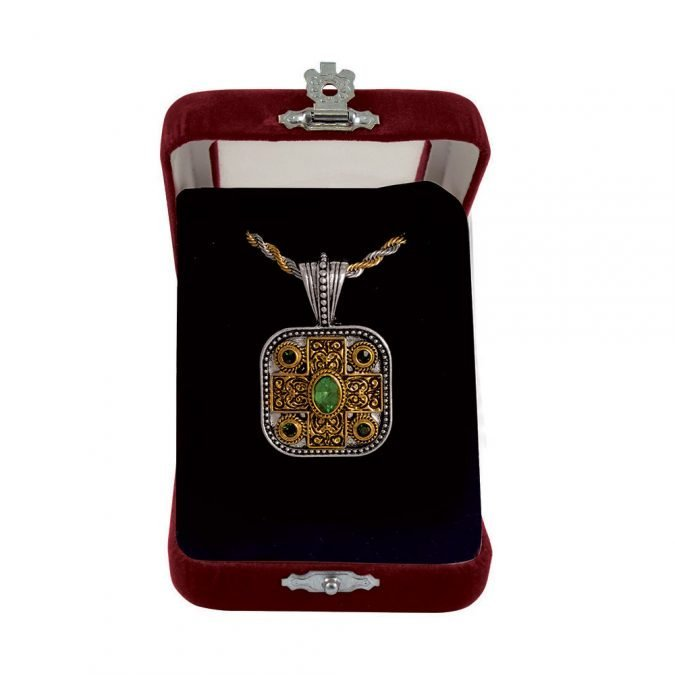 Σταυρός Λαιμού δίχρωμος με ανάγλυφο σχέδιο σε διάσταση : 3 x 3 εκ. Διατίθεται με πλεκτή αλυσίδα 55 εκατοστών από ατσάλι και σε βελούδινο κουτάκι.
