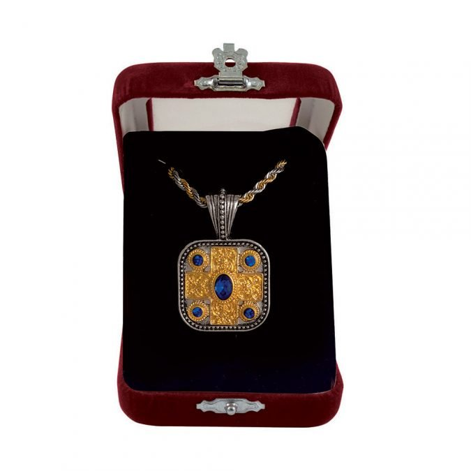 Σταυρός Λαιμού δίχρωμος με ανάγλυφο σχέδιο σε διάσταση : 3 x 3 εκ. Διατίθεται με πλεκτή αλυσίδα 55 εκατοστών από ατσάλι και σε βελούδινο κουτάκι.