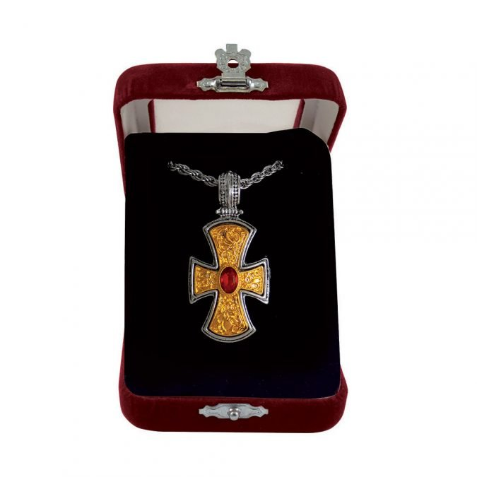 Σταυρός Λαιμού δίχρωμος με ανάγλυφο σχέδιο σε διάσταση : 3,5 x 3 εκ. Διατίθεται με πλεκτή αλυσίδα 55 εκατοστών από ατσάλι και σε βελούδινο κουτάκι.