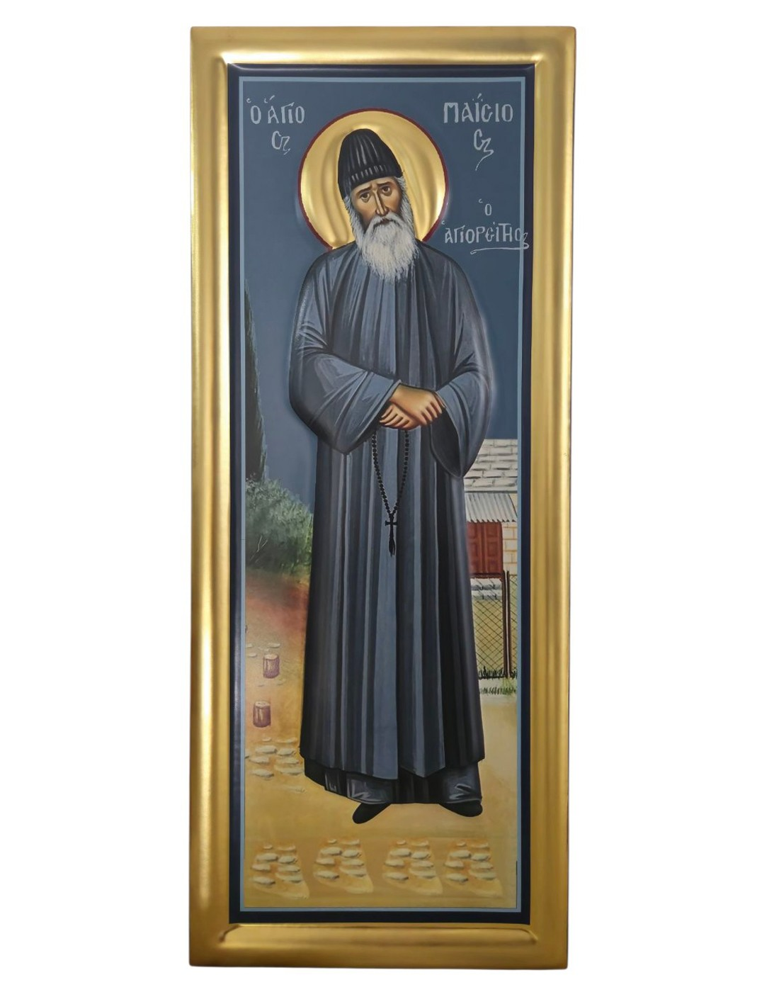 Άγιος Παίσιος σε ανάγλυφο καμβά με φύλλο χρυσού 24Κ σε ξύλο έλατο και διάσταση : 65 x 27 εκ.