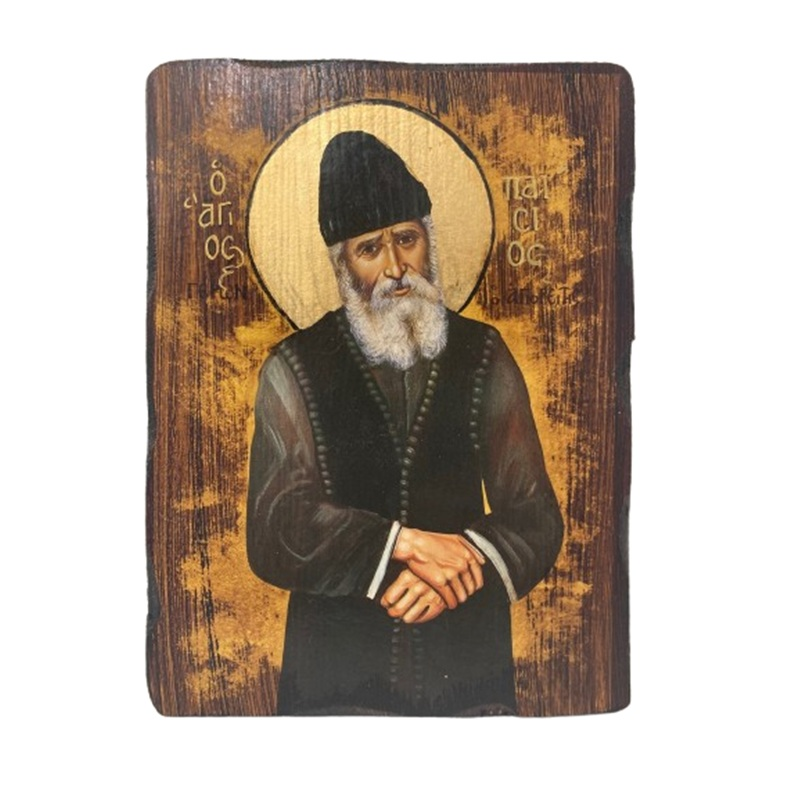 Άγιος Παϊσιος σε ξύλο έλατο με χειροποίητη παλαίωση, φύλλο χρυσού στο φωτοστέφανο και διάσταση : 26 x 20 εκ.