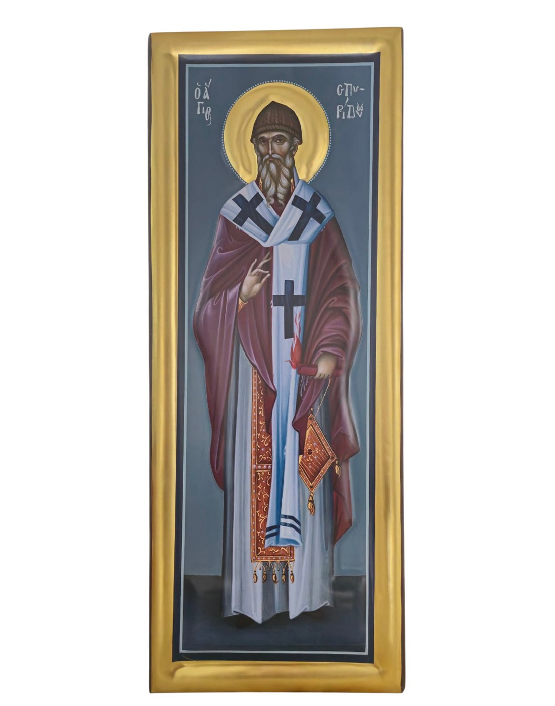 Άγιος Σπυρίδων σε ανάγλυφο καμβά με φύλλο χρυσού 24Κ σε ξύλο έλατο και διάσταση : 65 x 27 εκ.