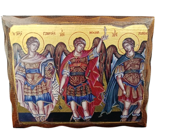 Αρχάγγελοι σε πεπαλαιωμένο πελεκυτό ξύλο πεύκο σε καμβά με φύλλο χρυσού και διάσταση : 20 x 16 εκ.