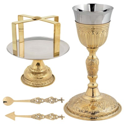 Δισκοπότηρο ορειχάλκινο σκαλιστό επιχρυσωμένο σε διάσταση : 26 εκ. Το σετ περιλαμβάνει 5 τεμάχια : Άγιο Ποτήριον, Δισκάριο, Αστερίσκο, Λόγχη, Λαβίδα.