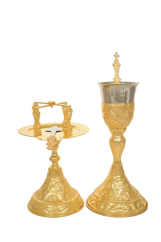 Δισκοπότηρο ορειχάλκινο ρώσικο σκαλιστό επίχρυσο χωρητικότητας 400ml σε διάσταση : 31 x 16 εκ. Δισκάριο ορειχάλκινο ρώσικο σκαλιστό επίχρυσο σε διάσταση : 20 x 18 εκ.