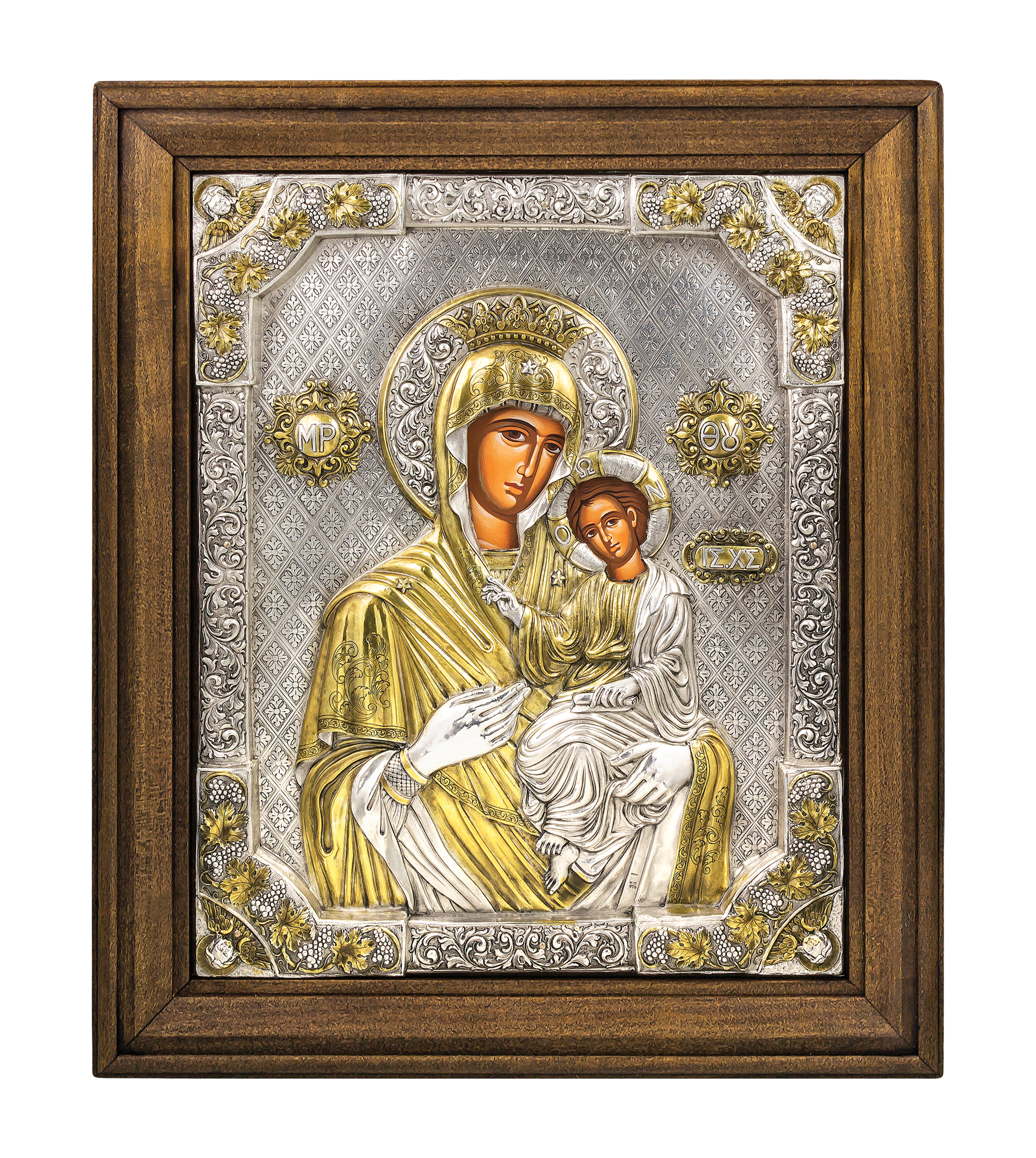 Εικόνα Παναγίας Οδηγήτριας ασημένια 950° με χρυσό 24 καράτια κορνίζα και τζάμι σε διάσταση : 62 x 53 εκ.