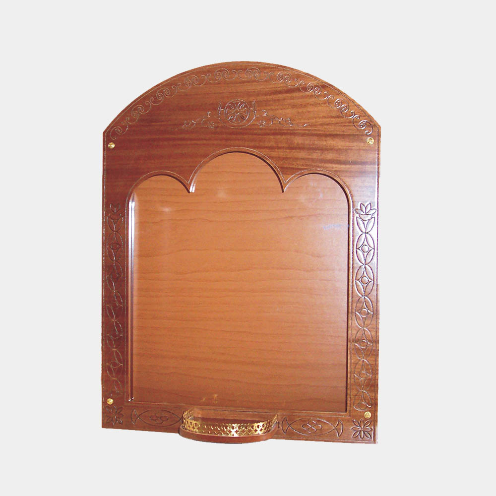 Εικονοστάσι ξύλινο ίσιο με βάση για καντήλι σε 2 διαστάσεις. Χάραξη στην πρόσοψη • Καρυδί χρώμα • Ίσια ή γωνιακά • Δύο μεγέθη • Με γάντζο ή βάση για το καντήλι • Συρόμενο τζάμι (όχι ανοιγόμενη πόρτα) • Χωρίς μεταλλικό σταυρό
