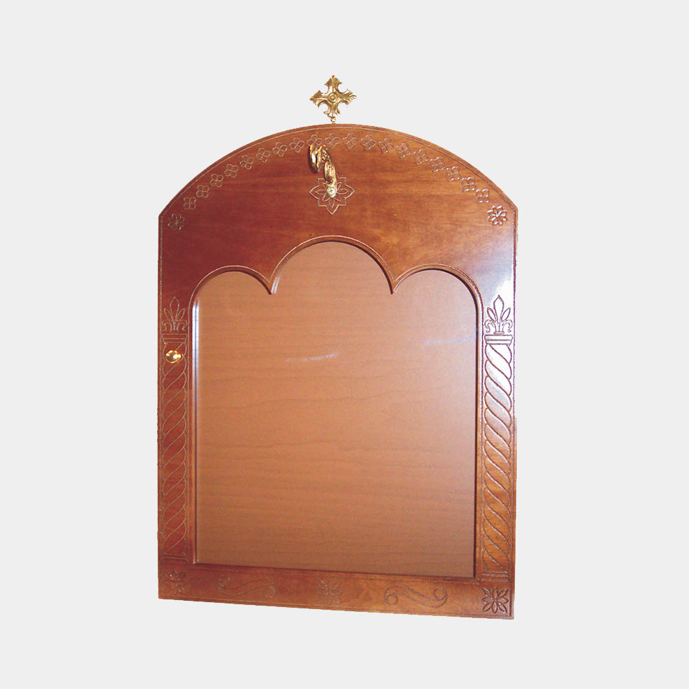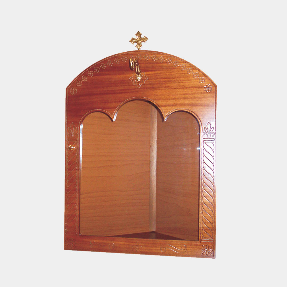 Εικονοστάσι ξύλινο ίσιο με γάντζο και σταυρό με ανοιγόμενη πόρτα σε 2 διαστάσεις Χάραξη στην πρόσοψη • Καρυδί χρώμα • Ίσια ή γωνιακά • Τρία μεγέθη • Με γάντζο ή βάση για το καντήλι • Με ανοιγόμενη πόρτα • Με μπρούτζινο σταυρό