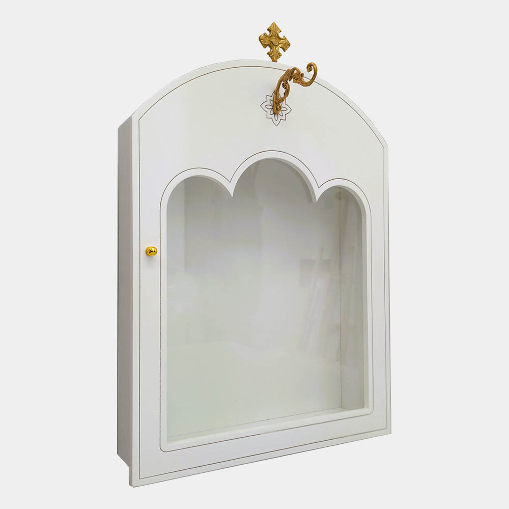 Εικονοστάσι ξύλινο ίσιο με γάντζο και σταυρό με ανοιγόμενη πόρτα σε 3 διαστάσεις Χάραξη στην πρόσοψη • Λευκό χρώμα • Ίσια ή γωνιακά • Τρία μεγέθη • Με γάντζο ή βάση για το καντήλι • Με ανοιγόμενη πόρτα • Με μπρούτζινο σταυρό