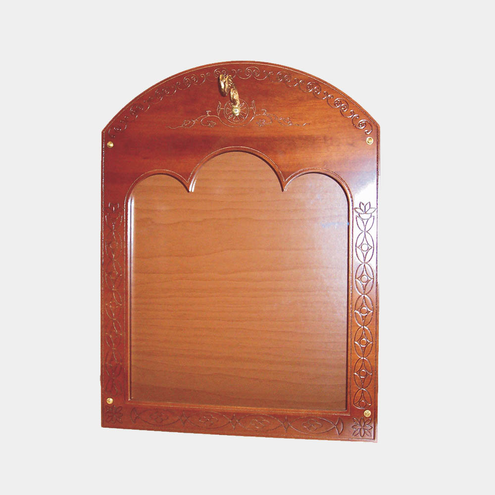 Εικονοστάσι ξύλινο ίσιο με γάντζο σε 2 διαστάσεις. Χάραξη στην πρόσοψη • Καρυδί χρώμα • Ίσια ή γωνιακά • Δύο μεγέθη • Με γάντζο ή βάση για το καντήλι • Συρόμενο τζάμι (όχι ανοιγόμενη πόρτα) • Χωρίς μεταλλικό σταυρό