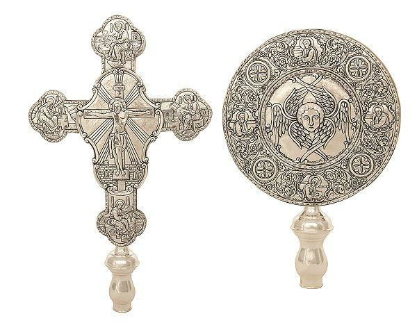 Εξαπτέρυγα ορειχάλκινα σκαλιστά μεγάλα σε χρώμα μαύρη πατίνα. Το σετ περιλαμβάνει δύο εξαπτέρυγα : ένα στρογγυλό και έναν σταυρό. Η διάσταση στο στρογγυλό είναι : 46 x 33 εκ. Η διάσταση στον σταυρό είναι : 66 x 41 εκ.