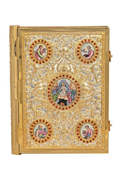 Ευαγγέλιο ορειχάλκινο σκαλιστό φουσκωτό δίχρωμο με εικόνες σε διάσταση : 36 x 27 εκ.