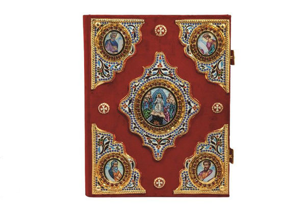 Ευαγγέλιο ορειχάλκινο σκαλιστό δίχρωμο με σμάλτο κομματιαστό και βελούδο σε διάσταση : 37 x 30 εκ.