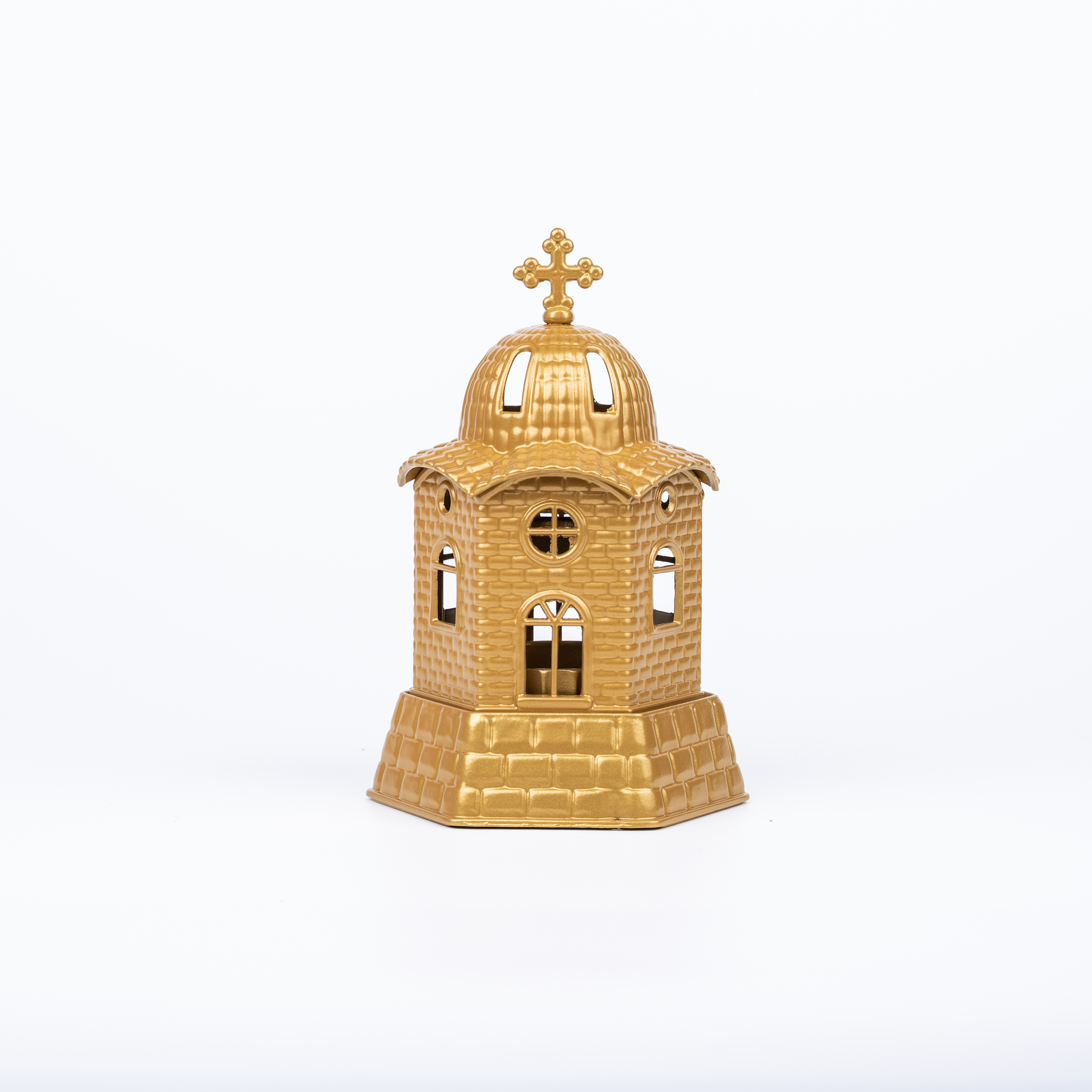 Καντήλι εκκλησάκι μεταλλικό μικρό σε χρώμα χρυσό και διάσταση : 17 x 10 εκ.