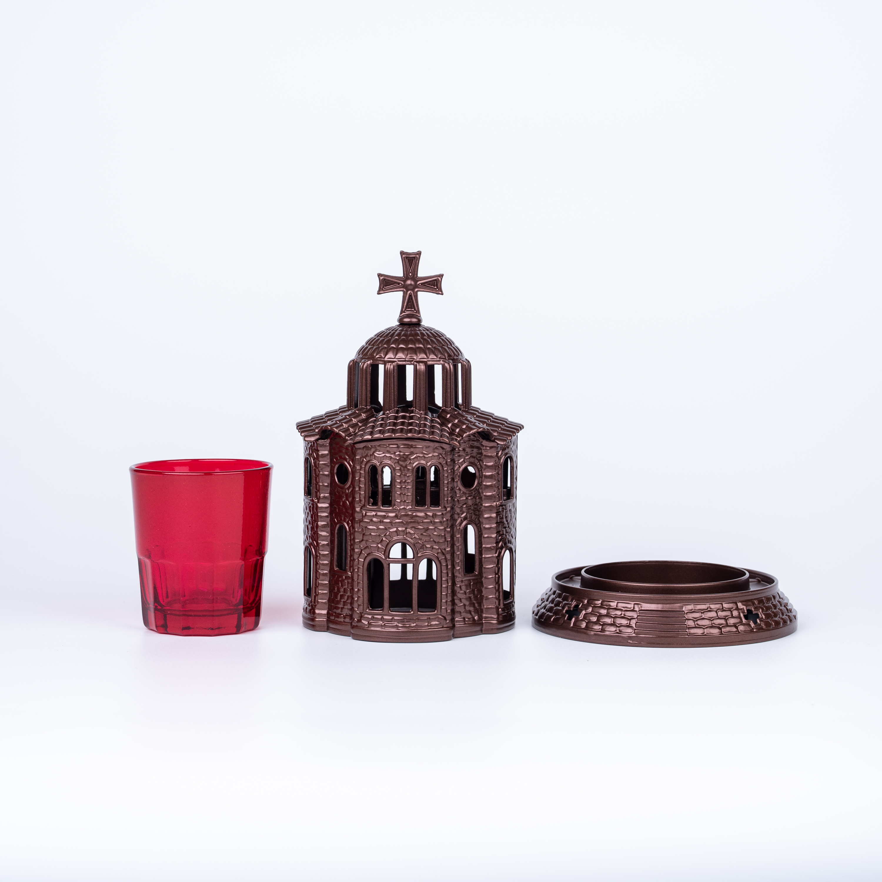 Καντήλι μεταλλικό εκκλησάκι μεγάλο σε χρώμα μπρονζέ και διάσταση : 19 x 11 εκ. Σημείωση: Συμπεριλαμβάνεται το ποτηράκι.