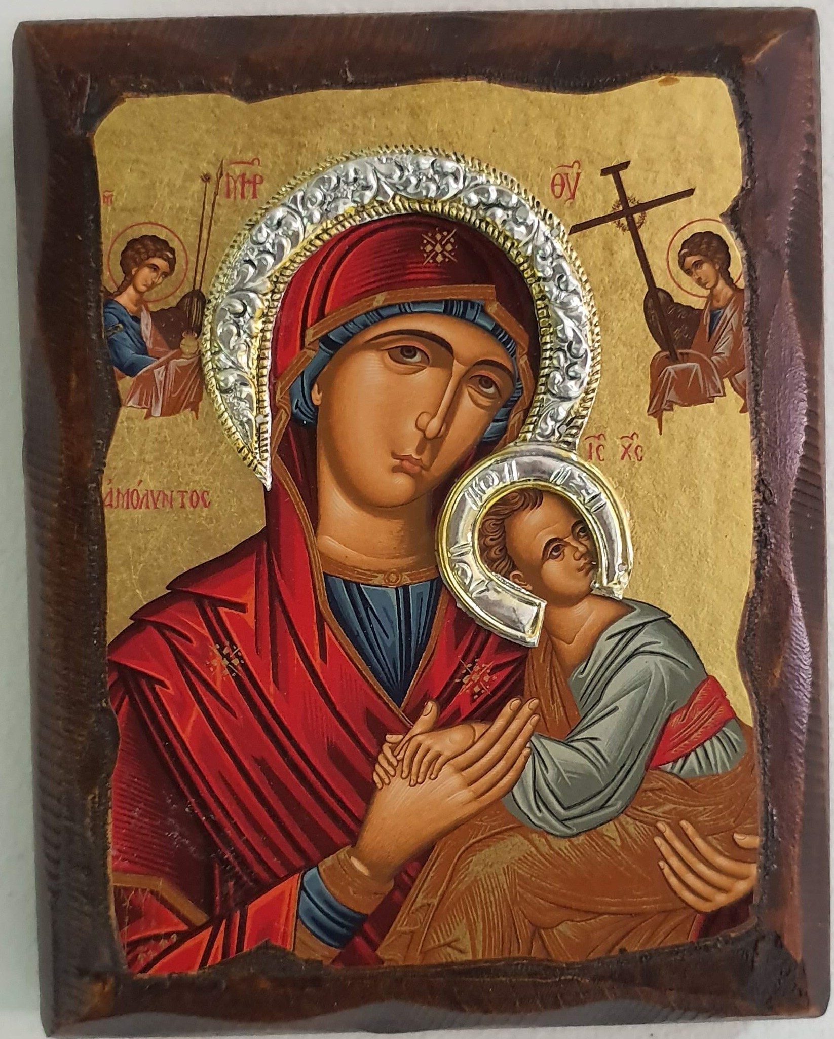 Παναγία Αμόλυντος σε καμβά με φύλλο χρυσού, ασημένιο φωτοστέφανο και διάσταση : 15 x 12 εκ.