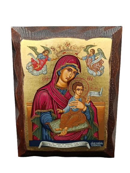 Παναγία Βρεφοκρατούσα σε πεπαλαιωμένο πελεκυτό ξύλο πεύκο σε καμβά με φύλλο χρυσού και διάσταση : 20 x 16 εκ.