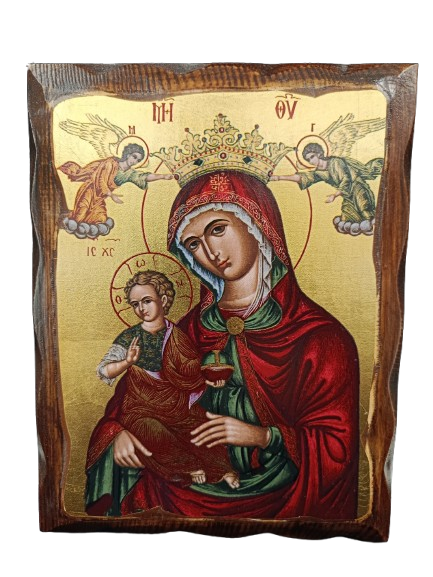 Παναγία Βρεφοκρατούσα σε πεπαλαιωμένο πελεκυτό ξύλο πεύκο σε καμβά με φύλλο χρυσού και διάσταση : 20 x 16 εκ.