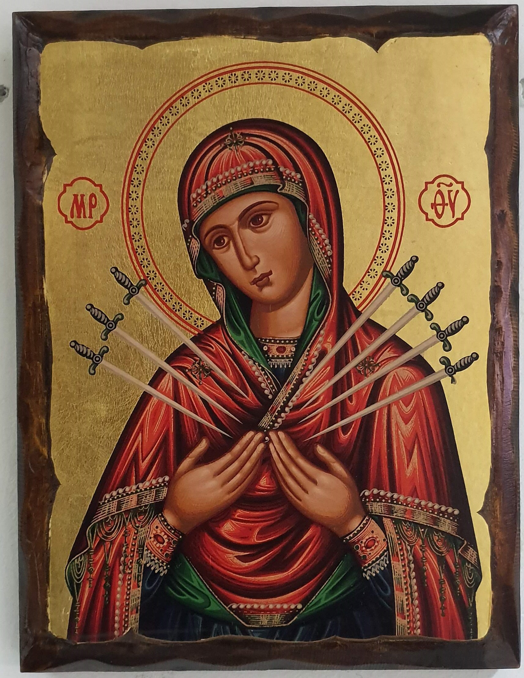 Παναγία Επτάσπαθη σε καμβά με φύλλο χρυσού σε ξύλο πεύκο και διάσταση : 15 x 12 εκ.