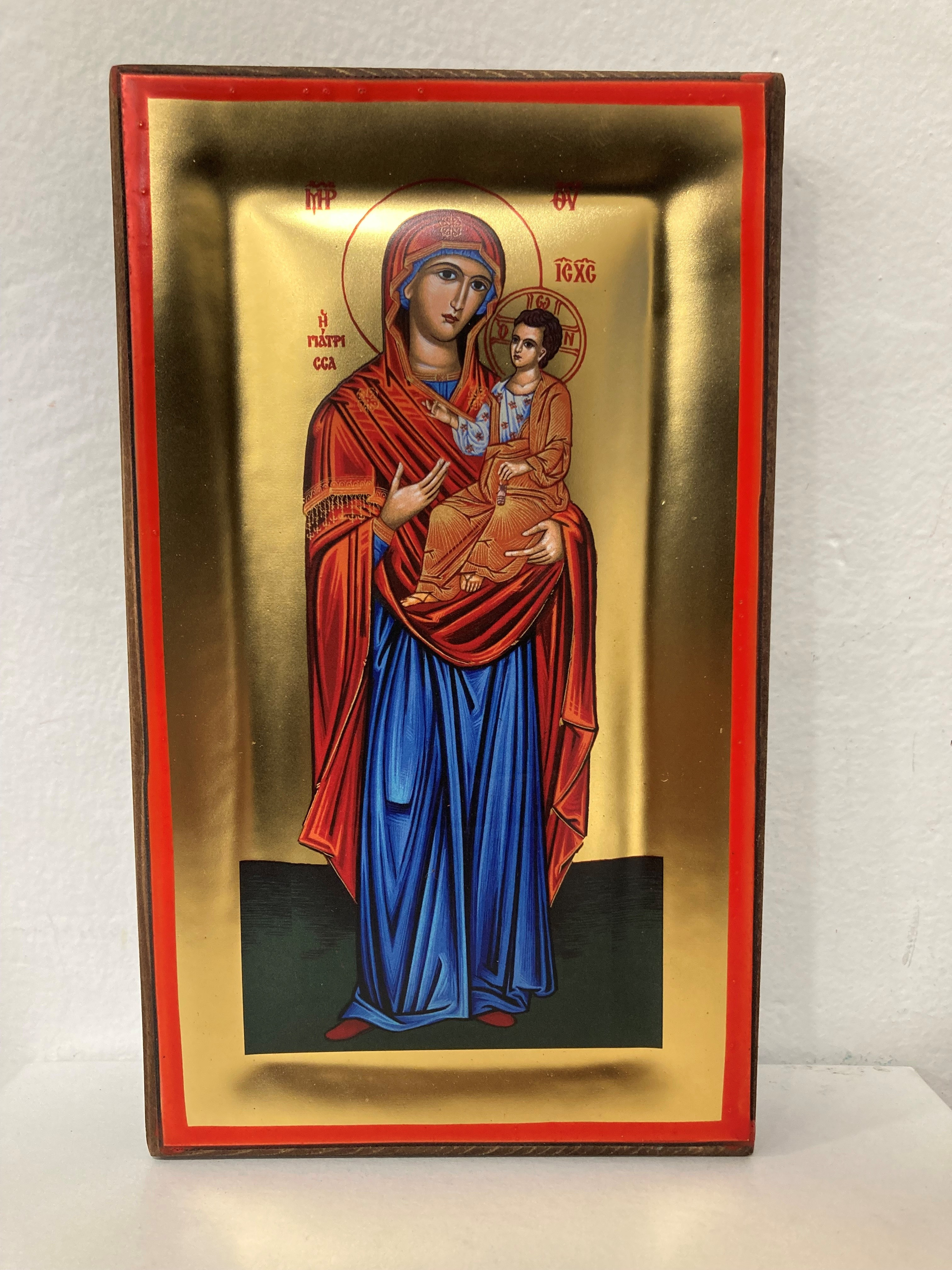 Παναγία Γιάτρισσα σε σκαφτό ξύλο με φύλλο χρυσού και διάσταση : 19 x 11 εκ.