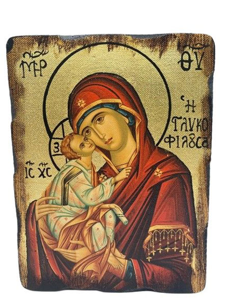 Παναγία Γλυκοφιλούσα σε ξύλο ελάτης με καμβά,φύλλο χρυσού,παλαίωση και βερνίκι σε διάσταση : 20 x 15 εκ.