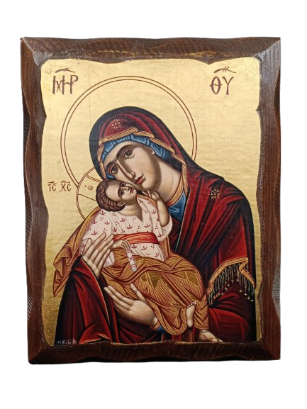 Παναγία Γλυκοφιλούσα σε πεπαλαιωμένο πελεκυτό ξύλο πεύκο σε καμβά με φύλλο χρυσού και διάσταση : 20 x 16 εκ.
