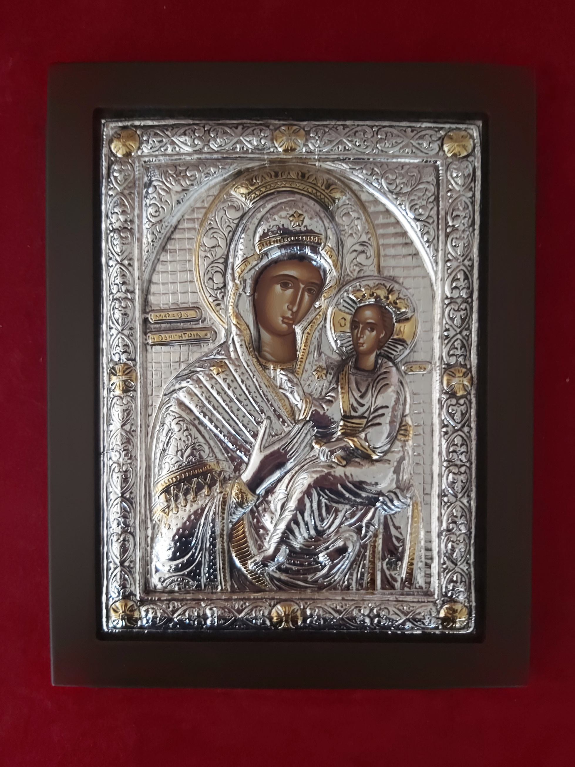 Παναγία Οδηγήτρια με φύλλο ασημιού και χρυσό 24Κ σε διάσταση : 24,5 x 19 εκ.