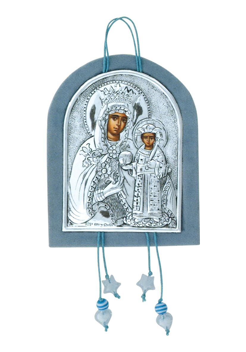 Εικόνα με φύλλο ασημιού 925° με αγίους σε χρώμα γαλάζιο ή ροζ και διάσταση : 12,5 x 10 εκ.