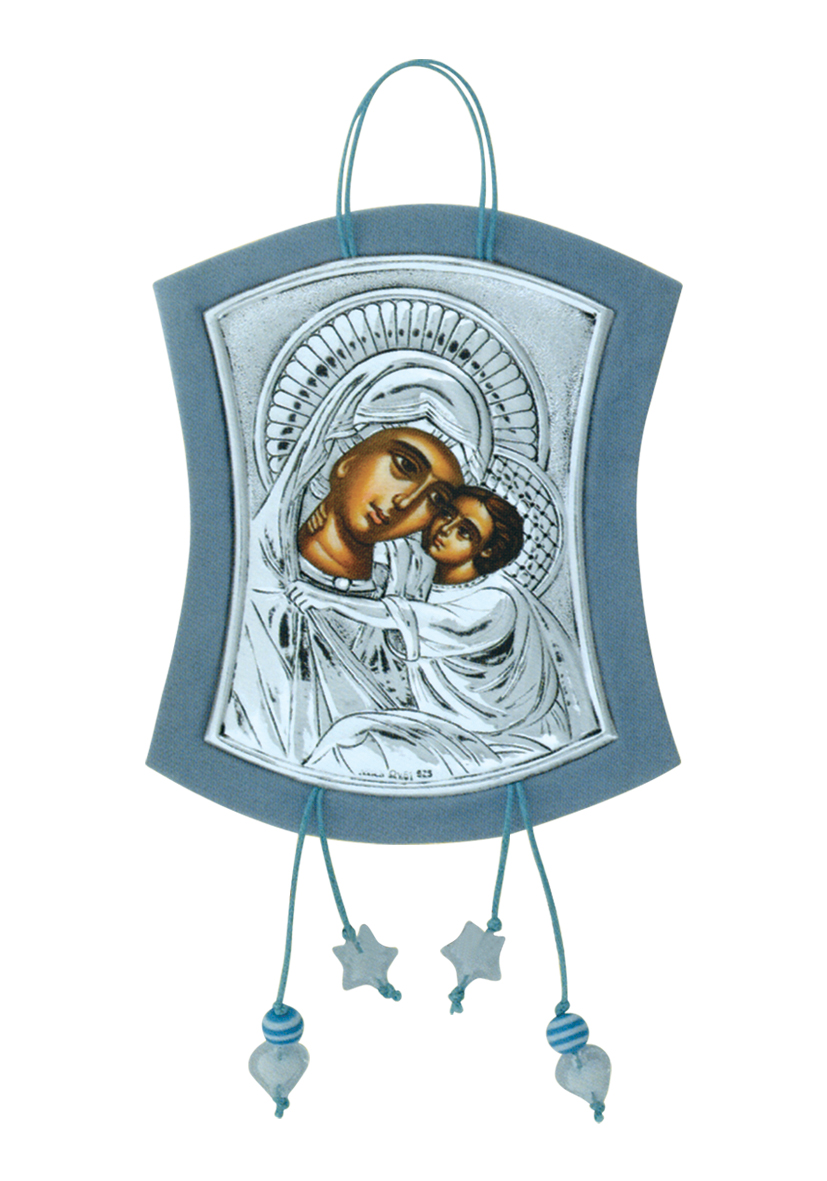Εικόνα με φύλλο ασημιού 925° με αγίους σε χρώμα γαλάζιο ή ροζ και διάσταση : 14,5 x 11 εκ.