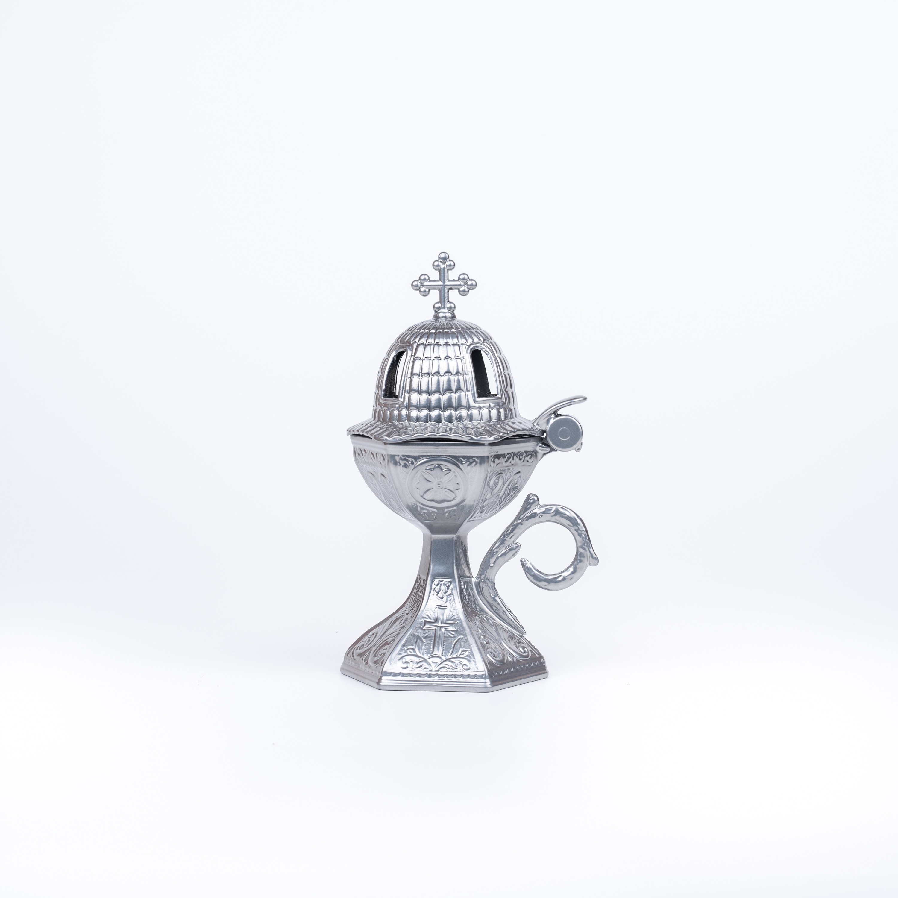 Θυμιατό μεταλλικό εκκλησάκι πολύγωνο σε χρώμα ασημί και διάσταση : 17 x 10 εκ.